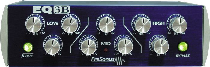 EQ3B均衡器有3个带有重叠频率的全参数带,还有1个高通滤波器,80Hz的截止频率和1个分路按键。3个增益控制器都有中央制动,前面板标的频率范围分别为20Hz-300Hz, 200Hz-3kHz 和2kHz-20kHz。增益范围为±12dB,Q值的变化范围为0.1到10。总谐波失真+噪声(未加权)在0dB时是0.006%,噪声底线为-98dB,这要比信噪比为95dB的效果还要好。输入输出也在后面板上,既有非平衡的接口又有平衡的卡农头.