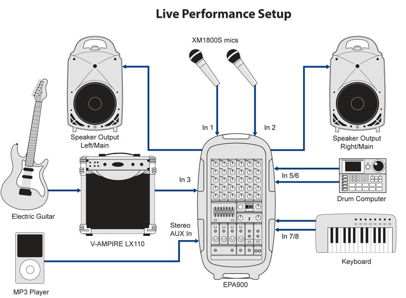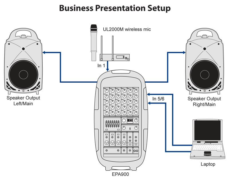 该EPA900是一个完整的体系。 只要使用内置的车轮从车上滚它在舞台上,在桌面上设置主机和部署扬声器。 连接高质量的动态麦克风和电源开关打到-瞧,即时广播系统! 甚至还有一个附带的麦克风,配件和电缆船上的储藏格。 如果你需要添加一些严重的底端到系统中,只需连接到一个有源低音炮输出插孔方便的小组。